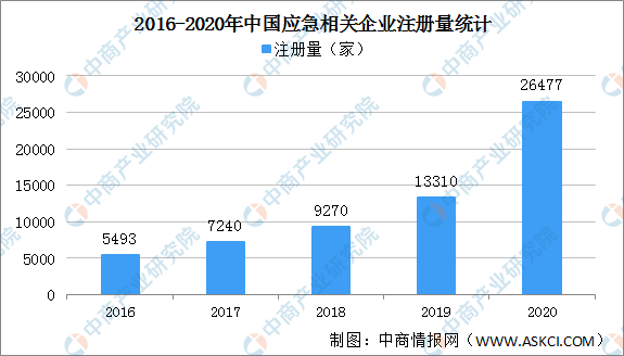 新冠肺炎疫情的爆发,使得应急产业异军突起成为新蓝海。目前,已有不少企业加速研发、创新,争取早进细分市场寻找机会。据企查查数据,2016年应急相关企业注册量仅5493家,2020年疫情爆发,应急产业关注度明显提升,应急相关产业注册量26477家,同比增长98.9%。