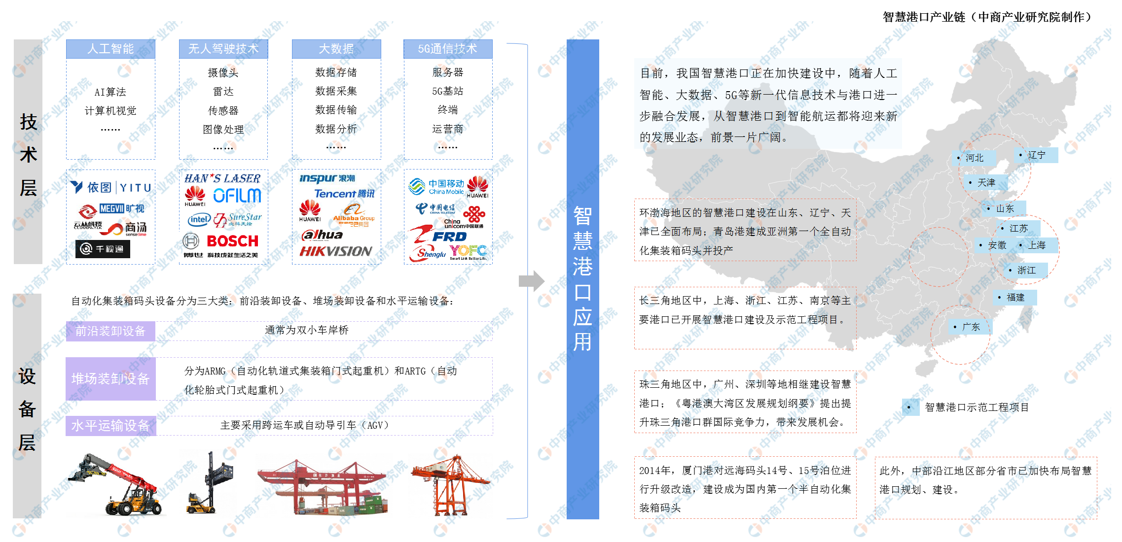 从技术层来看,智慧港口涉及人工智能、大数据、信息化、自动化等技术。从设备层来看,基于技术层,集装箱装卸设备、散货装卸设备、港口调度、货物运输、航运消息等环节都将智能化。