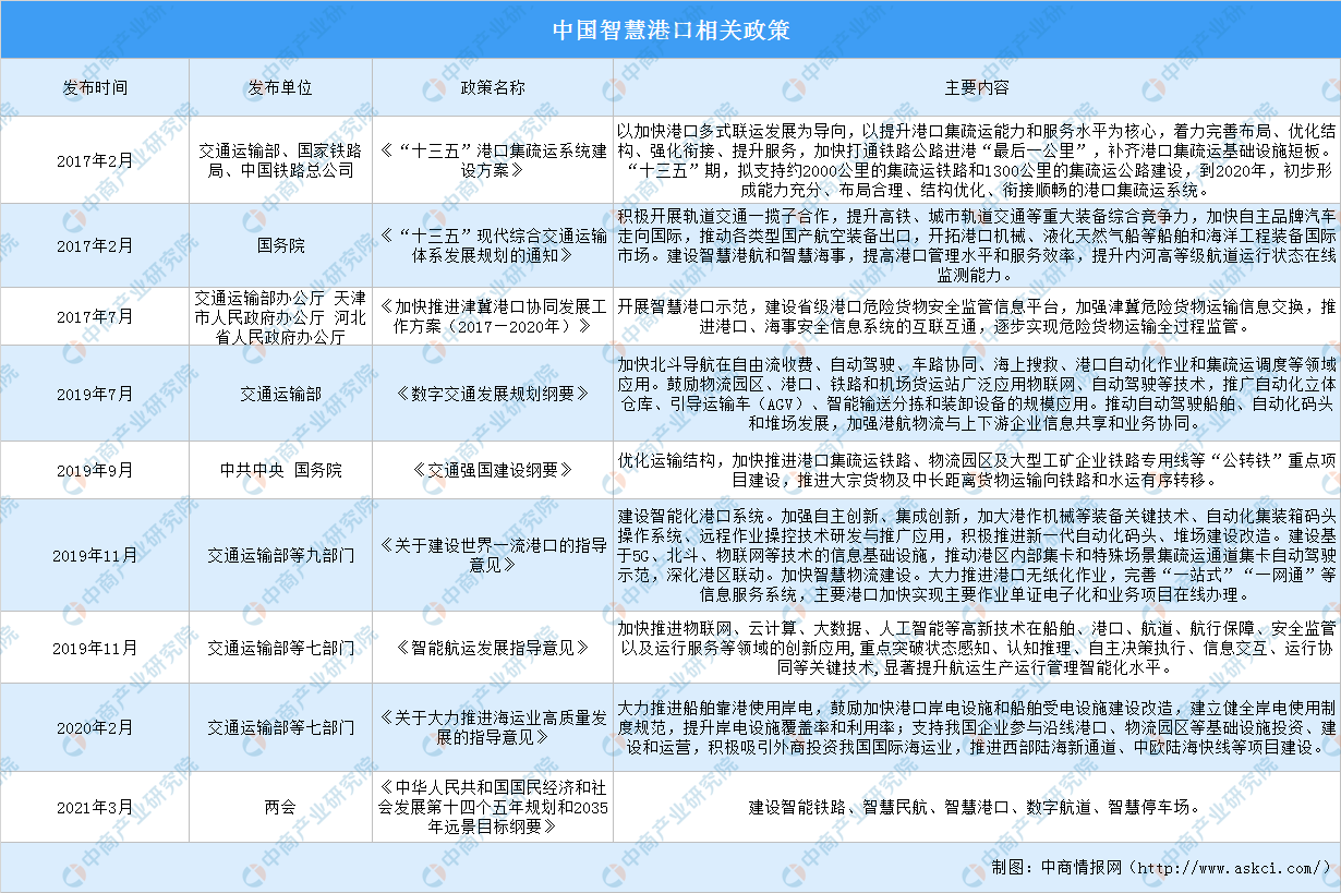 2019年11月,交通运输部等九部门联合发布《关于建设世界一流港口的指导意见》,要求建设智能化港口系统,加快智慧物流建设。