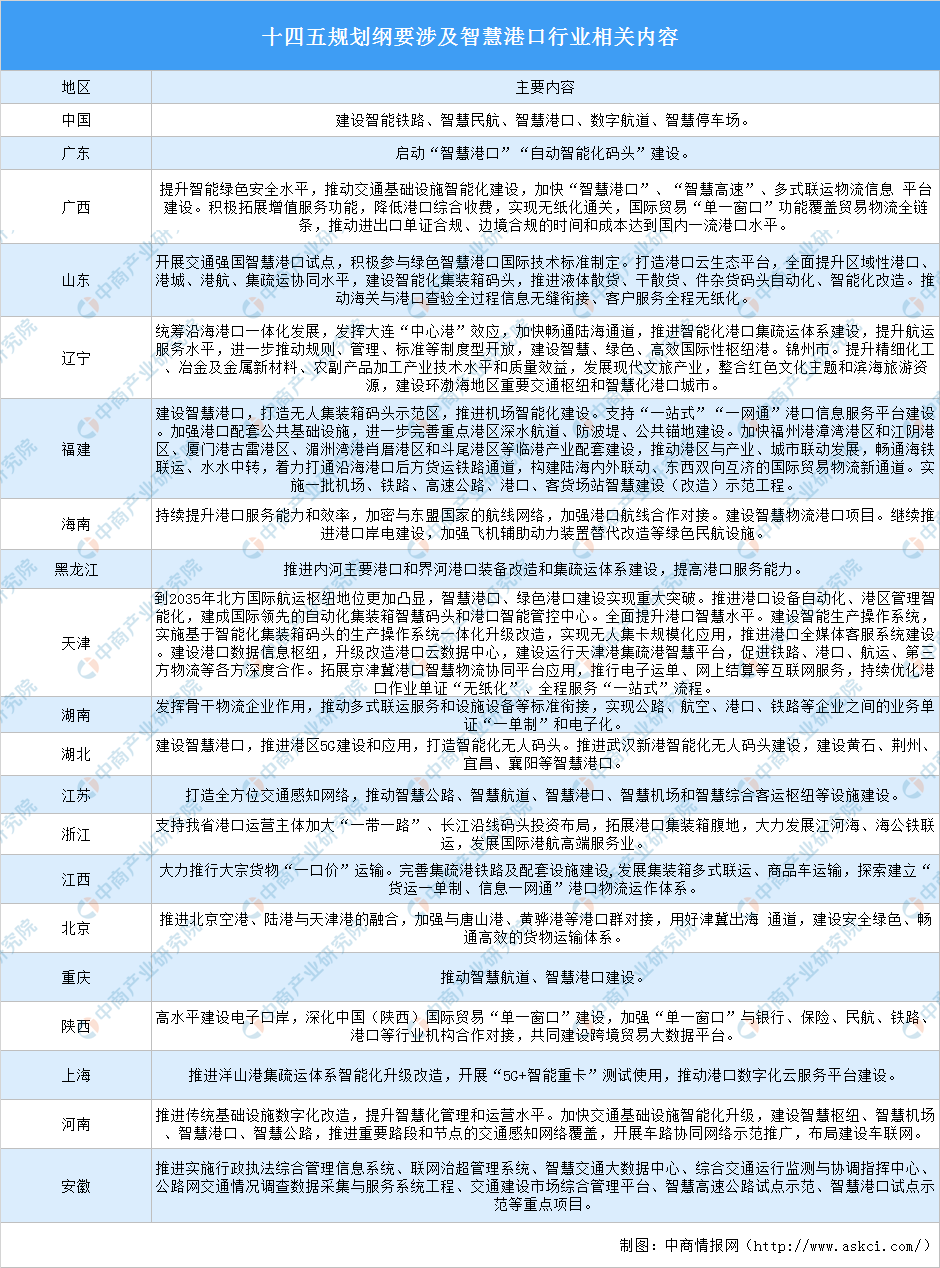 港口智能化是港口发展的大方向,中国重视智慧港口建设。中国十四五规划纲要提出,建设智能铁路、智慧民航、智慧港口、数字航道、智慧停车场。目前19省市十四五规划纲要均提及智慧港口相关内容。